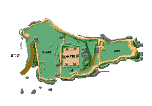 の城の中で最も眺めのすばらしい所です。独立した山の頂上からの眺望は360度遮るものは無く、北に金武湾、南に中城湾が広がり、一の郭から見渡すとまる
